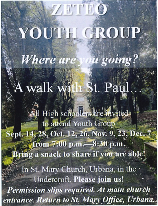 Be sure to get one permission slip per teen at the main entrance of the Church and return completed form to the St. Mary parish office, Urbana.